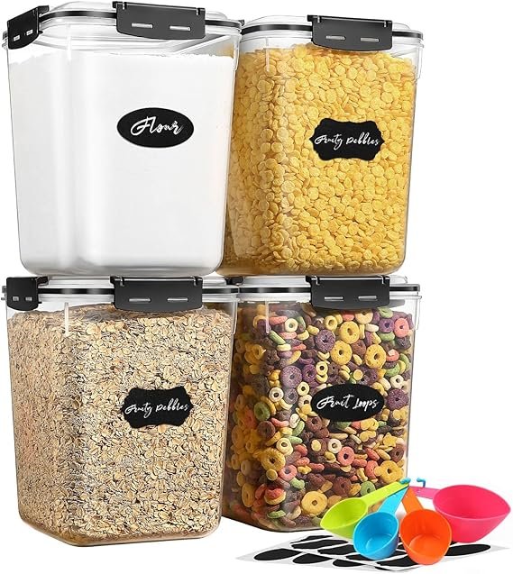 VERSATILE FOOD CONTAINERS: The size of each container is 18.7*18.7*23cm ( 5.3L), with a large capacity. These pantry storage containers are perfect for various bulk foods, such as beans, cookies, pasta, grains, cereal, rice, snacks, and chips